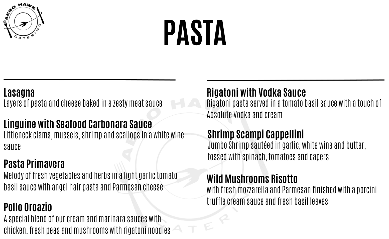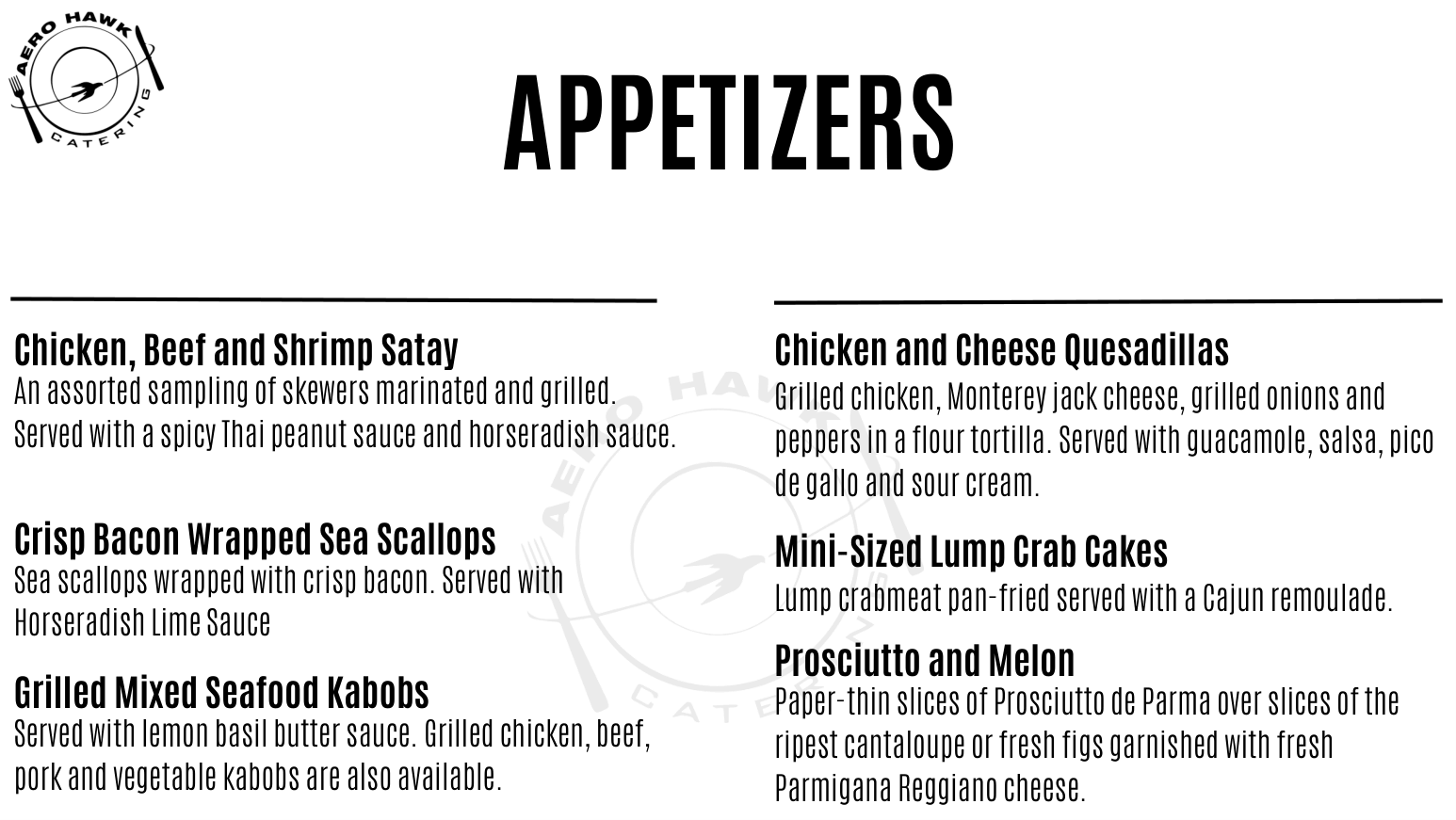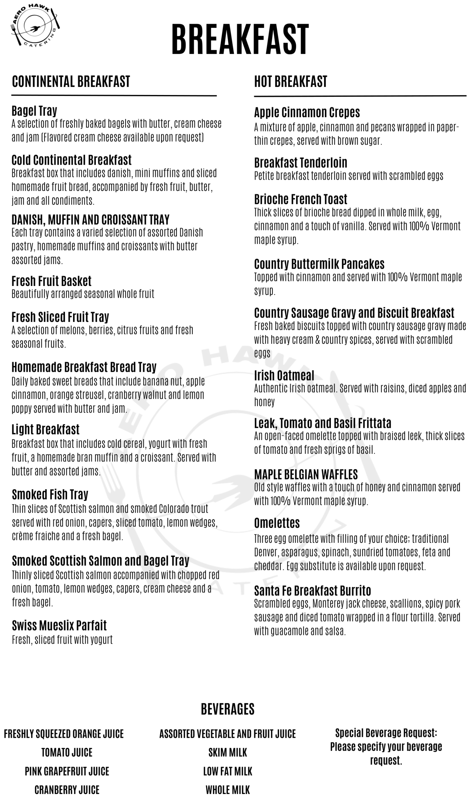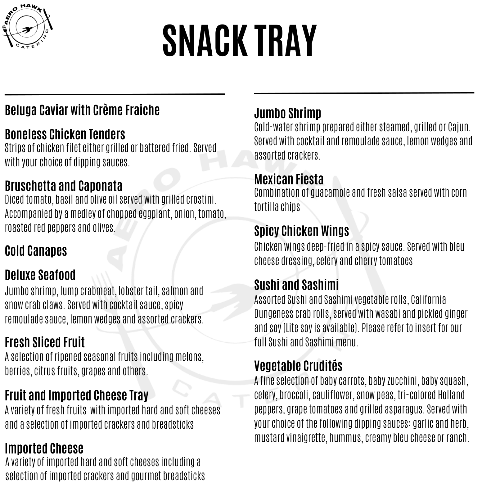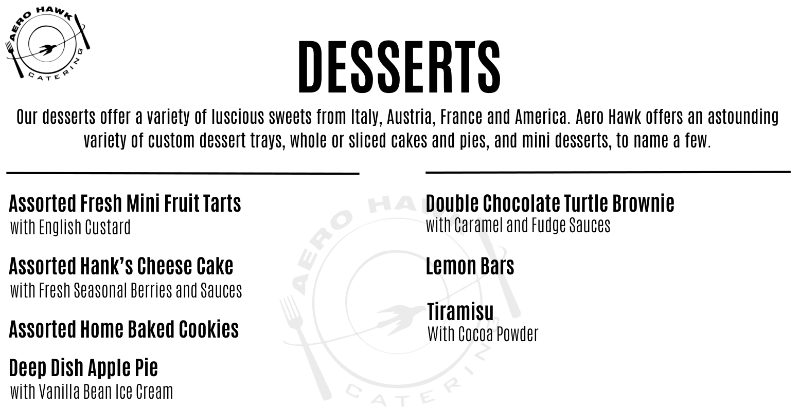 Our desserts offer a variety of luscious sweets from Italy, Austria, France and America. Aero Hawk offers an astounding variety of custom dessert trays, whole or sliced cakes and pies, and mini desserts, to name a few.