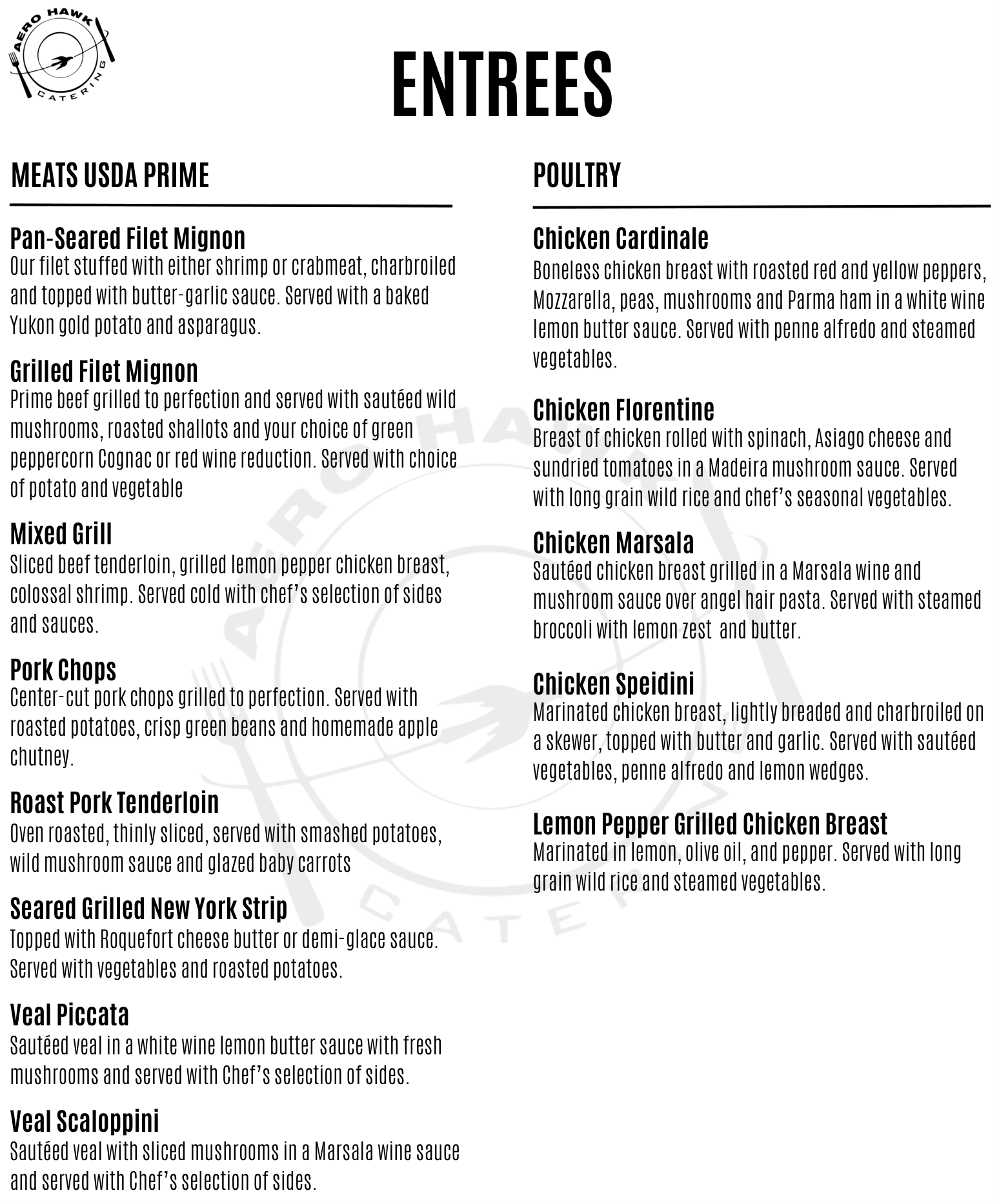 Boneless chicken breast with roasted red and yellow peppers, Mozzarella, peas, mushrooms and Parma ham in a white wine lemon butter sauce. Served with penne alfredo and steamed baby vegetables.